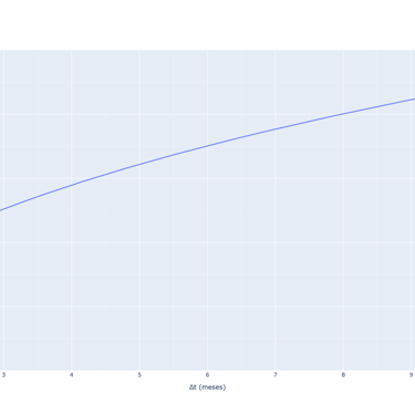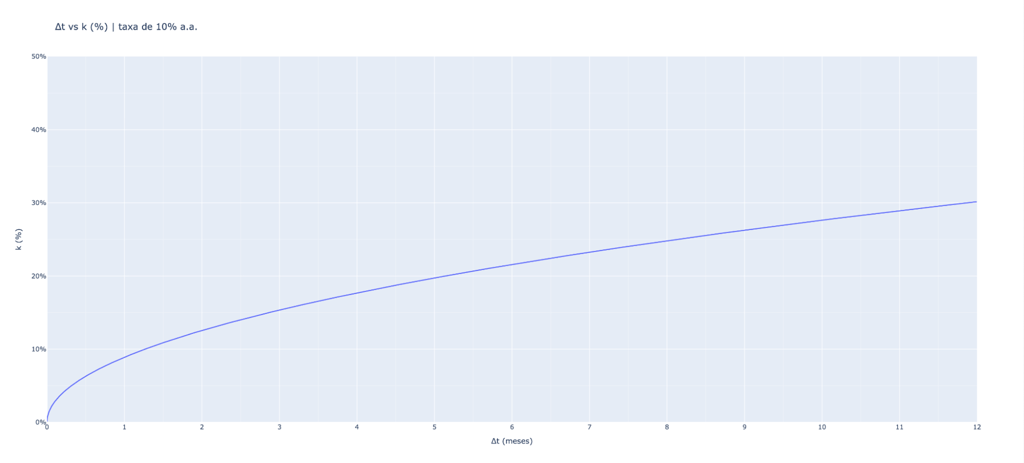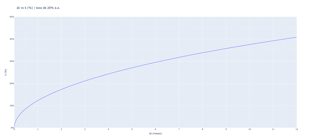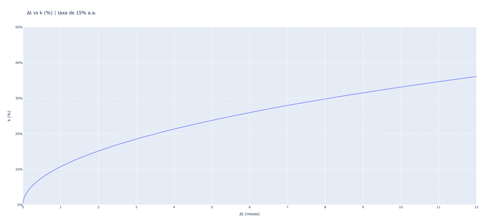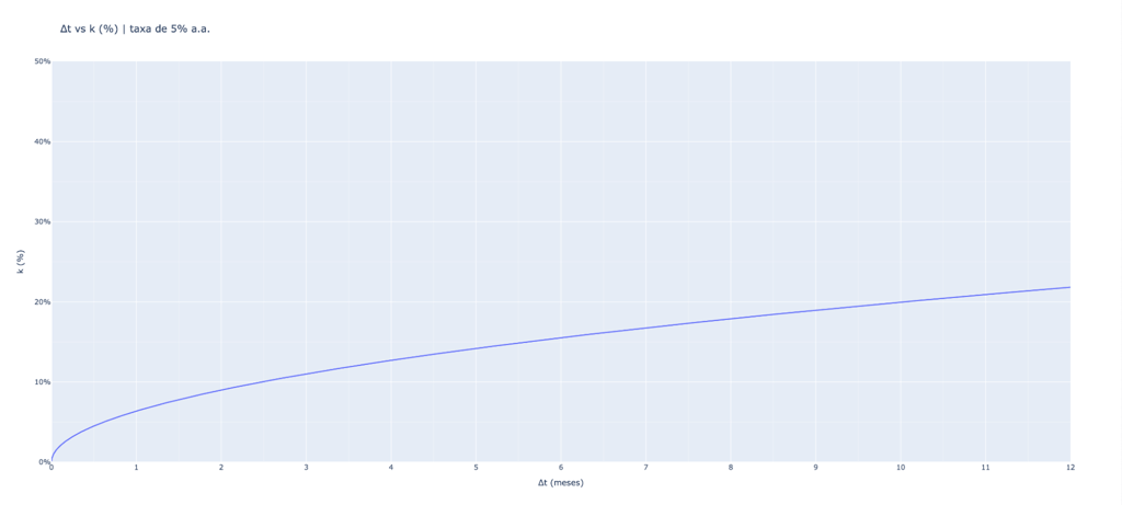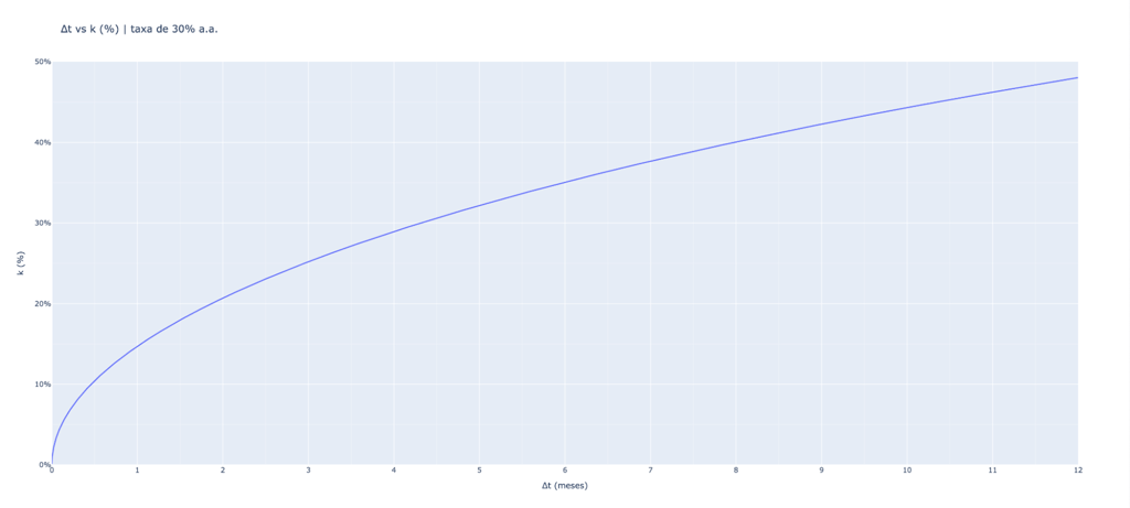 Temos a fórmula mais simples até o momento, e com apenas 3 variáveis (Δt, k e i), ficando muito mais fácil visualizar em gráficos, para isso vamos fazer a seguintes cenários de rentabilidade: 5%, 10%, 15%, 20%, 30% a.a. Para limitar o tamanho do gráfico iremos colocar um Δt máximo de 1 ano.