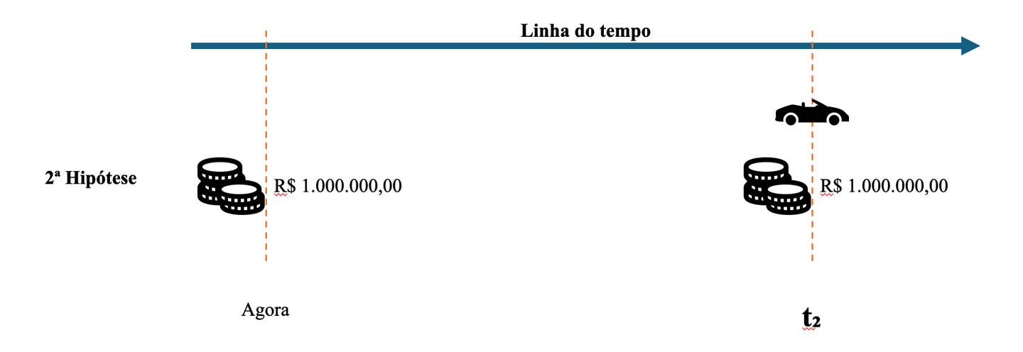 Para facilitar nossa análise vamos chamar o tempo da 1ª Hipótese de t₁ e o tempo da 2ª Hipótese de t₂. Podemos enxergar as duas hipóteses da seguinte forma com base na linha do tempo: