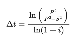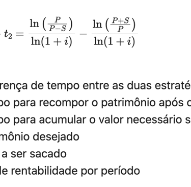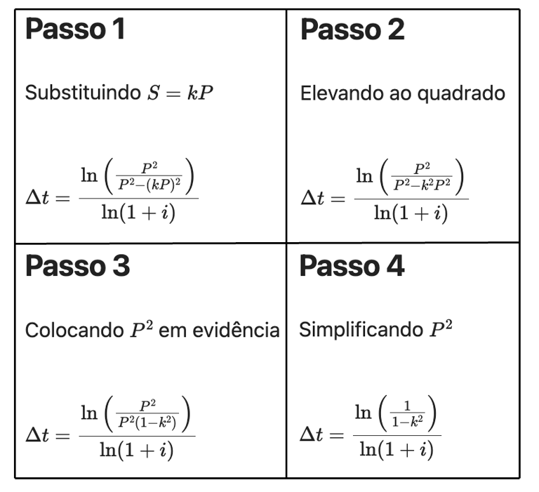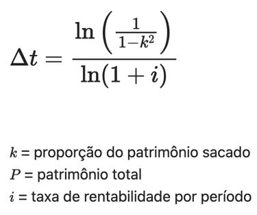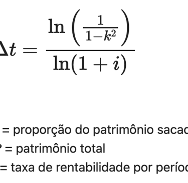 Percebam que no nosso exemplo, colocamos o patrimônio desejado com o valor de R$ 1.000.000,00 e o valor a ser sacado de R$ 150.000,00, ou seja 15% do patrimônio. Se a nossa intenção é criar um fator da decisão para diferentes patrimônios e diferentes saques, tudo com a finalidade de visualizar quando o Custo de Oportunidade Temporal (Δt), podemos simplificar essa fórmula colocando S como uma porcentagem de P, para isso vamos chamar essa proporção de k.