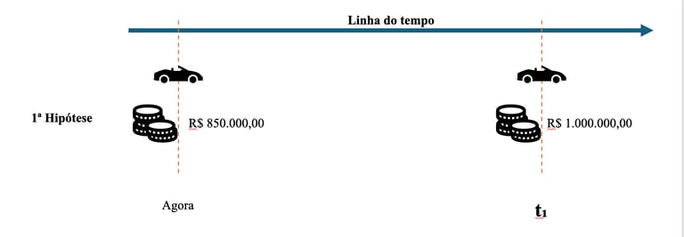 Percebam que os valores de R$ 1.000.000 e R$ 150.000 permanecem constantes ao longo de toda a análise. Isso ocorre porque estamos comparando duas estratégias sobre a mesma base econômica: comprar agora ou comprar depois.